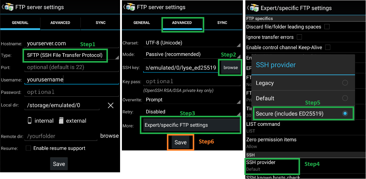 AndFTP 5.3 increases security level by adding more encryption algorithms such as ED25519. To enable it you need to activate the "Secure" SSH provider in expert settings: