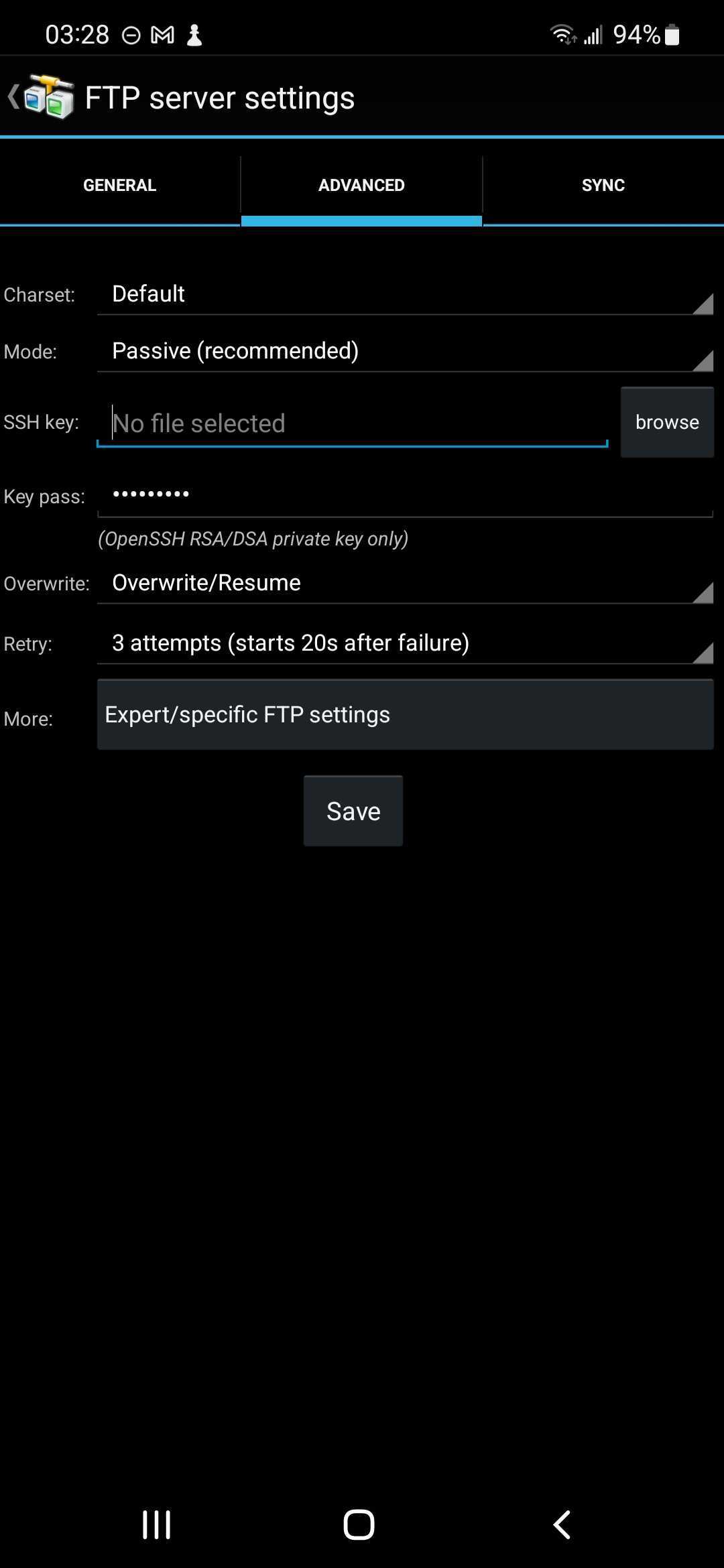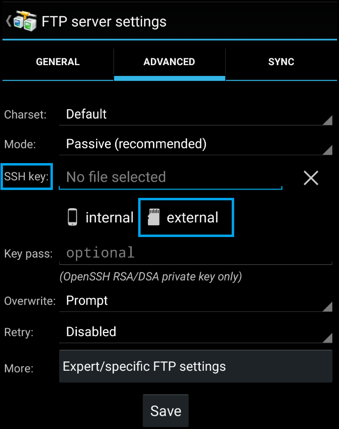 Authentication FailedAndFTPPro 6.0 / Android 12 with id_rsaAndFTPPro 6.0 / Android 12 with id_rsaIn AndFTP v6.0 on Android 12 (Samsung), there is no "external" available within the "Advanced" tab. I have toyed with it, and continually get the following: